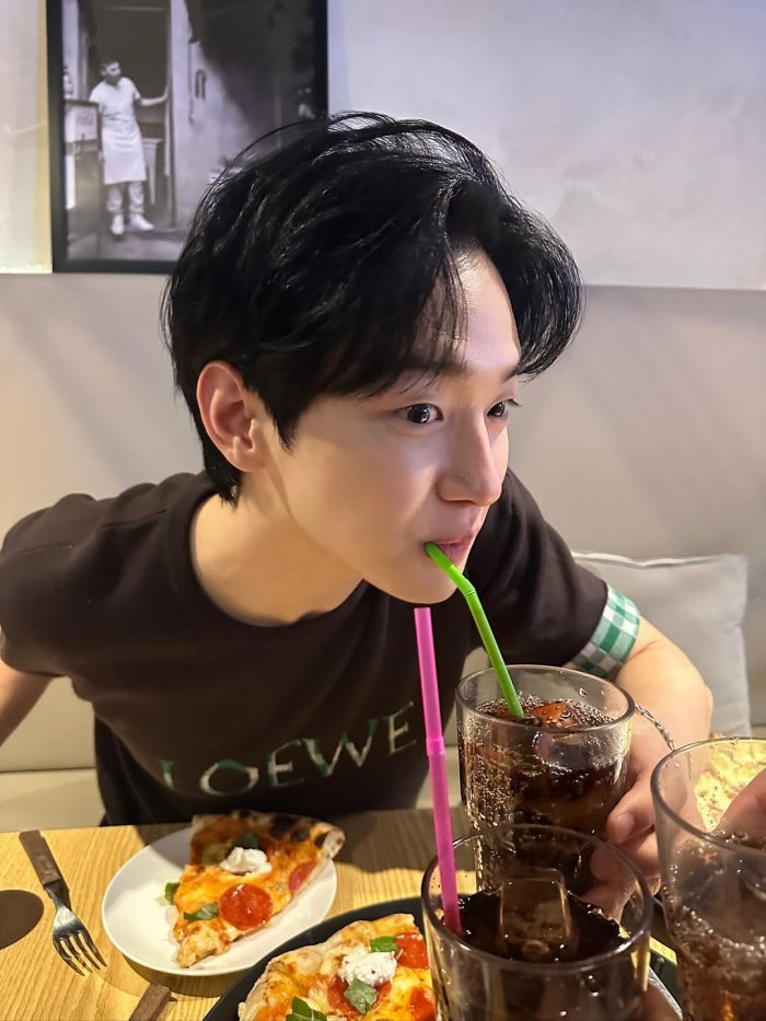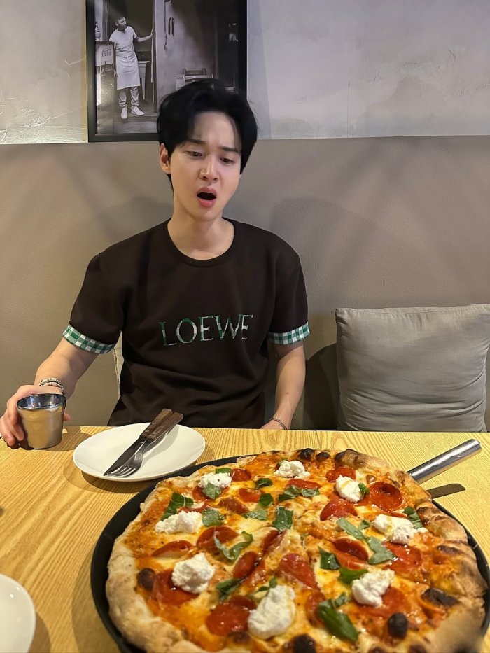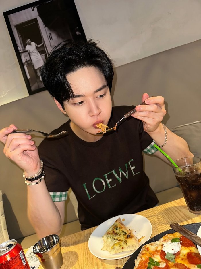 공개된 사진 속 장동윤은 편안한 티셔츠 차림으로 식탁에 앉아 피자를 즐기고 있다. 밝은 표정과 여유로운 분위기가 돋보이며 자연스러운 일상이 팬들에게 친근하게 다가온다.