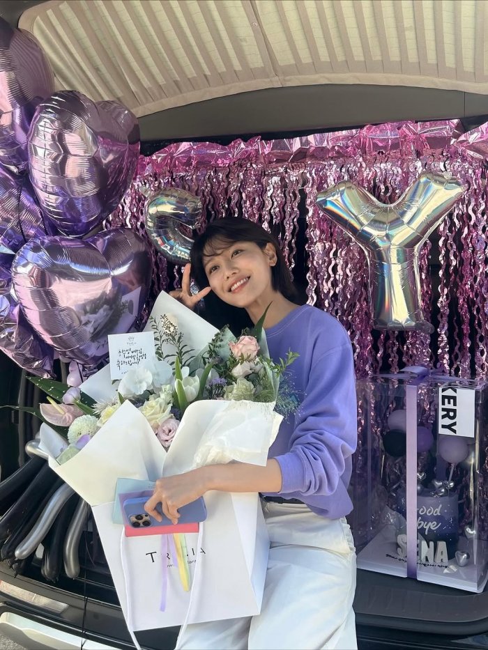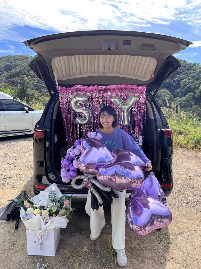 사진 속 수영은 차량 트렁크 앞에서 보라색 풍선을 들고 환한 미소를 짓고 있다. 그는 캐주얼한 보라색 스웨트셔츠와 화이트 팬츠를 매치해 편안한 무드를 자아냈으며 주변의 꽃 장식들이 어우러져 화사한 분위기를 더했다.