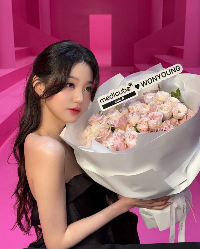 사진 속 그는 화려한 분홍색 배경 앞에서 매력적인 미소를 짓고 있다. 특히 장원영은 블랙 드레스와 긴 웨이브 헤어스타일로 우아한 분위기를 자아냈다.