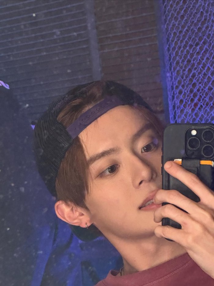 공개된 사진 속 강민은 편안한 분위기 속에서 거울 셀카를 찍고 있다. 보랏빛 모자를 쓴 모습이 캐주얼하면서도 스타일리시하며, 자연스러운 미소가 돋보인다. 그의 표정과 패션은 자연스러운 매력을 더하고 있다.