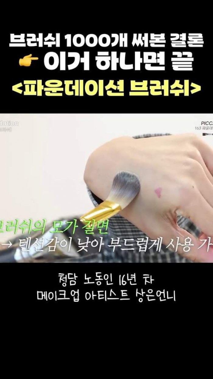 1. 그래서 16년 차 메이크업 아티스트 '상은언니'의 추천템은 무엇이냐고요? 바로 피카소 163 파운데이션 브러시와 필리밀리 S 매끈결필터 파운데이션 브러시 827이랍니다.