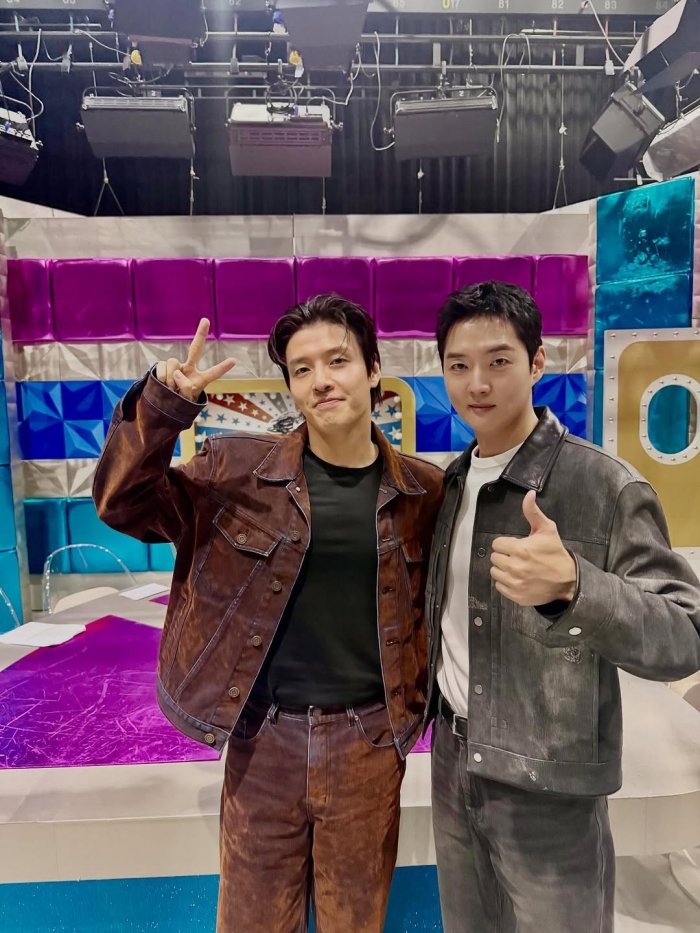 공개된 사진 속 강하늘과 강영석은 MBC 예능 '라디오스타' 촬영장에서 나란히 포즈를 취하고 있다. 강하늘은 브이 포즈로 강영석은 엄지척 제스처로 환하게 웃으며 친근한 분위기를 자아냈다. 두 사람 모두 캐주얼한 재킷 스타일로 편안하면서도 세련된 매력을 드러냈다.