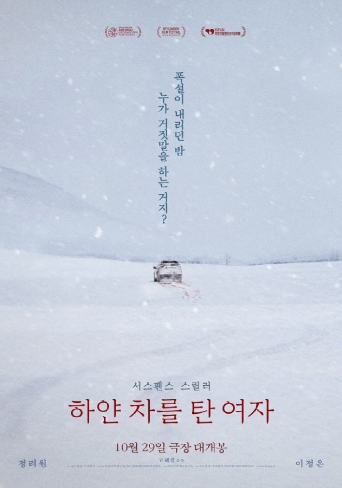 '하얀 차를 탄 여자'는 피투성이 언니를 싣고 병원에 도착한 도경(정려원 분)이 경찰 현주(이정은 분)에게 혼란스러운 진술을 하면서 그날의 진실을 파헤쳐가는 서스펜스 스릴러다. 영화는 이미 제22회 샌디에고 국제 영화제에서 베스트 인터내셔널 피처(BEST INTERNATIONAL FEATURE)를 수상했으며, 제66회 BFI 런던영화제 스릴 부문에도 공식 초청됐다.