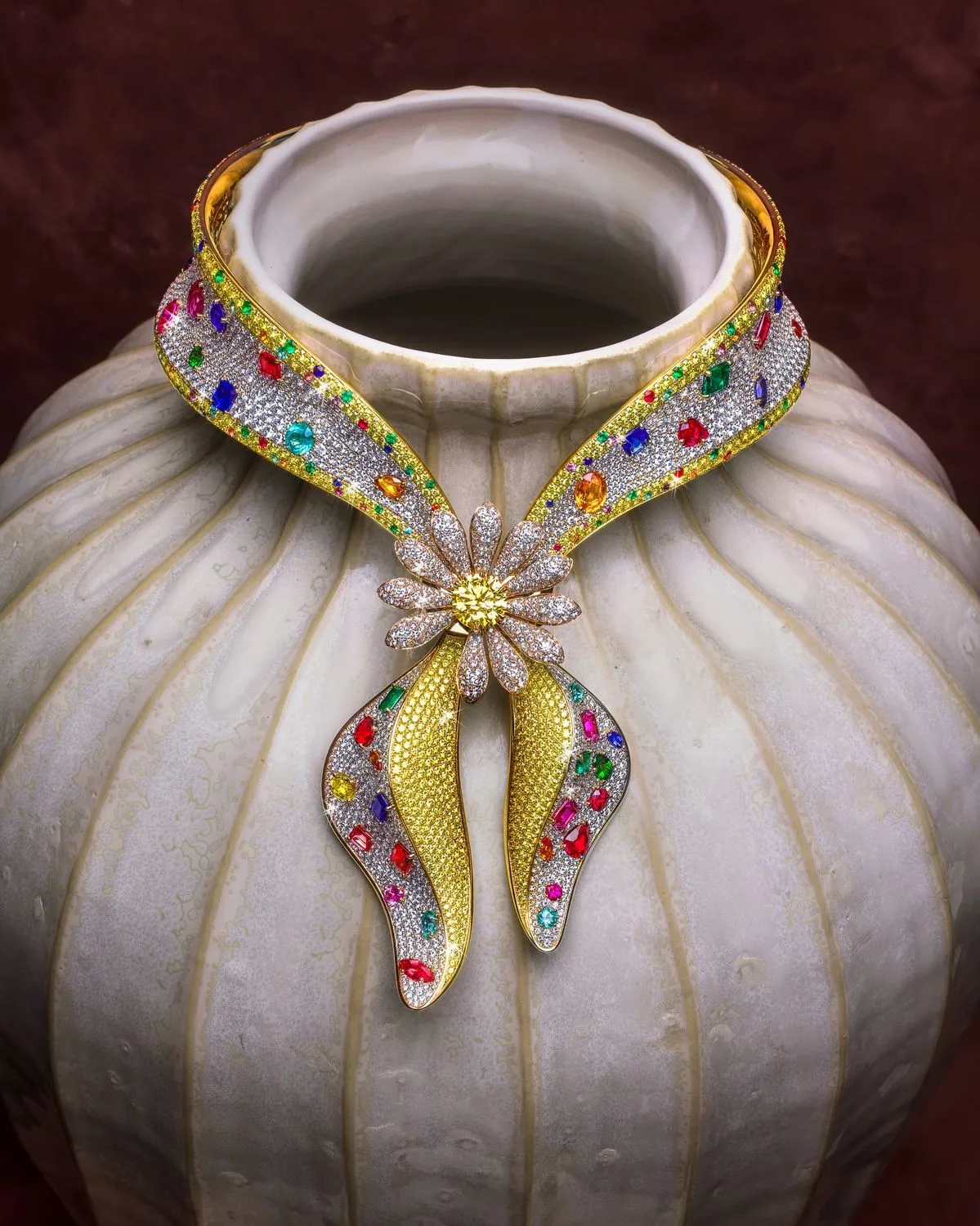 Đây là sản phẩm của thương hiệu đồng hồ và trang sức cao cấp toàn cầu Jacob & Co., mẫu “The Bandana Royale” được chế tác độc bản chỉ dành cho G-Dragon. Tác phẩm sử dụng nền vàng, đính hơn 200 carat kim cương, nổi bật với viên kim cương vàng 5,4 carat ở trung tâm cùng nhiều loại đá quý như ruby, emerald khiến ai nhìn cũng phải chú ý.