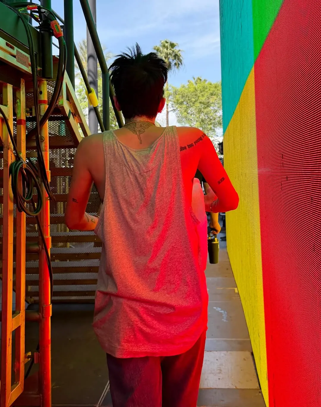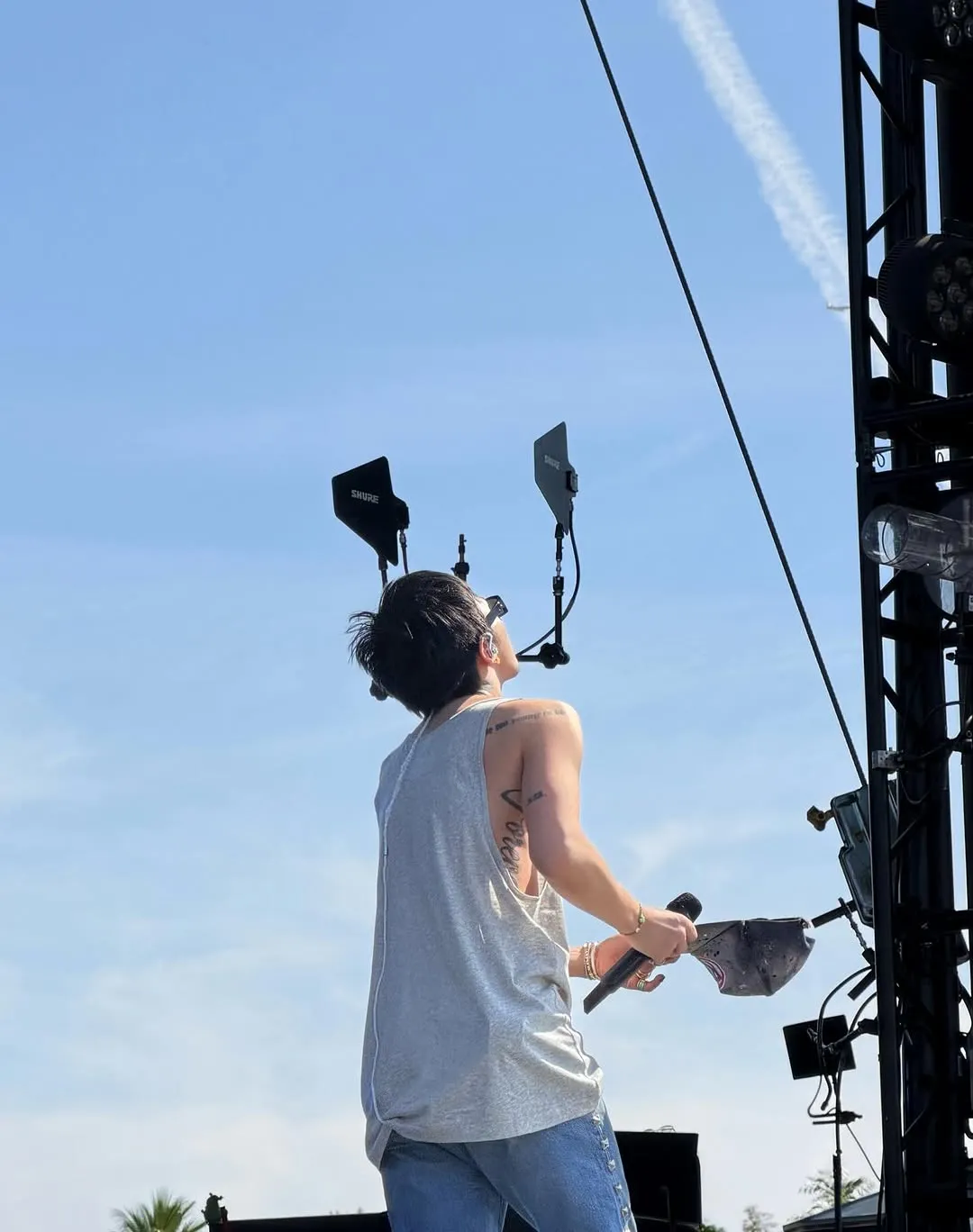 In the photos, he’s clearly deep in concert prep, staying busy while taking in the vibe of the venue. His casual outfit and relaxed poses pop against the scene, and his easy smile — framed by blue skies and nature — adds a refreshing twist to the shots.