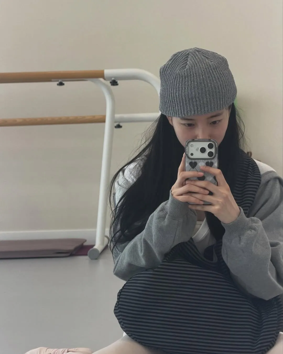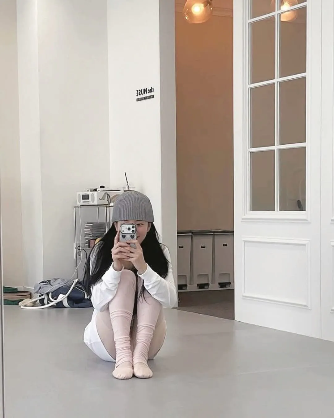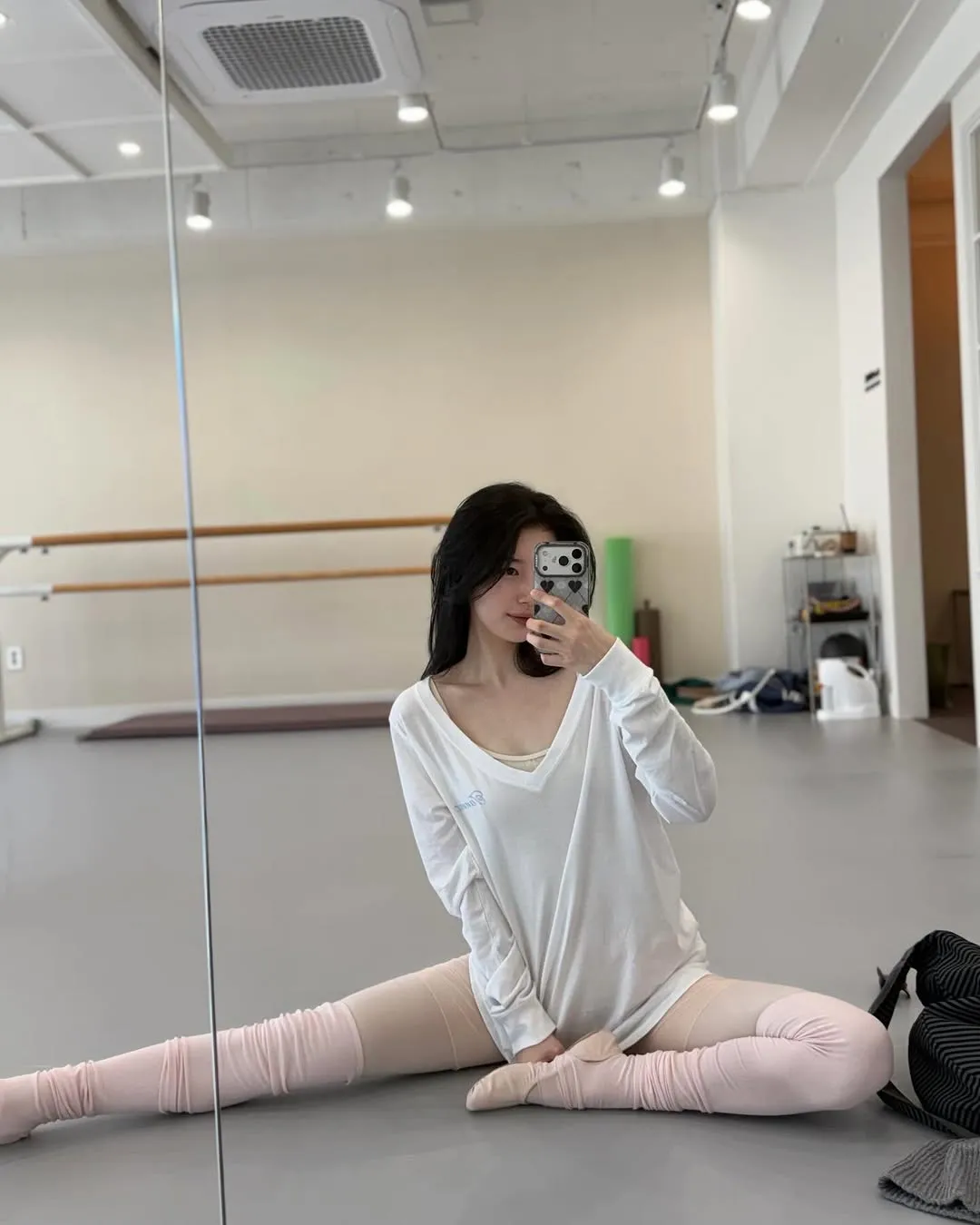 Wearing a pink leotard, leg warmers, and a white top, she warms up at the barre and strikes poses in front of the mirror. Her effortless, pure visuals and well‑toned physique stand out—especially her long, lean arms and legs and sleek shoulder line that drew gasps.
